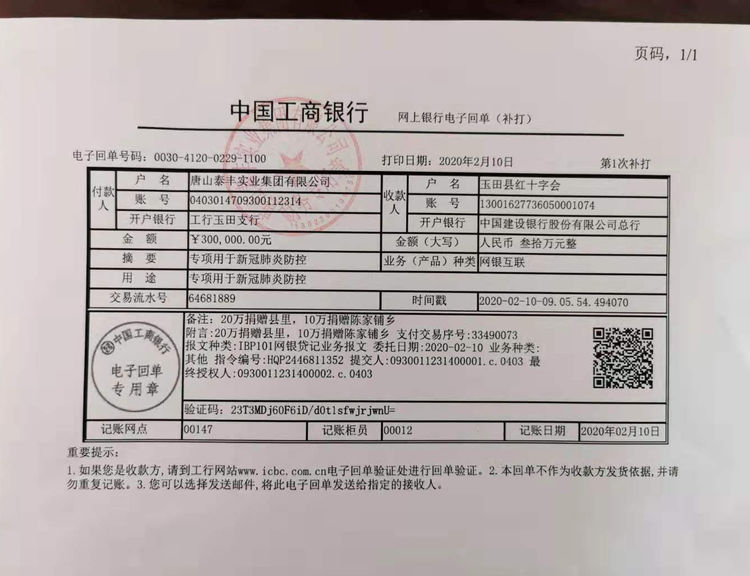 2月10日,拼搏在线(中国)唯一官方网站有限公司向玉田县红十字会定向捐赠30万元,专项用于新冠肺炎防控,20万元捐赠县里,10万元捐赠陈家铺乡,全力支持县、乡抗击新冠肺炎疫情。